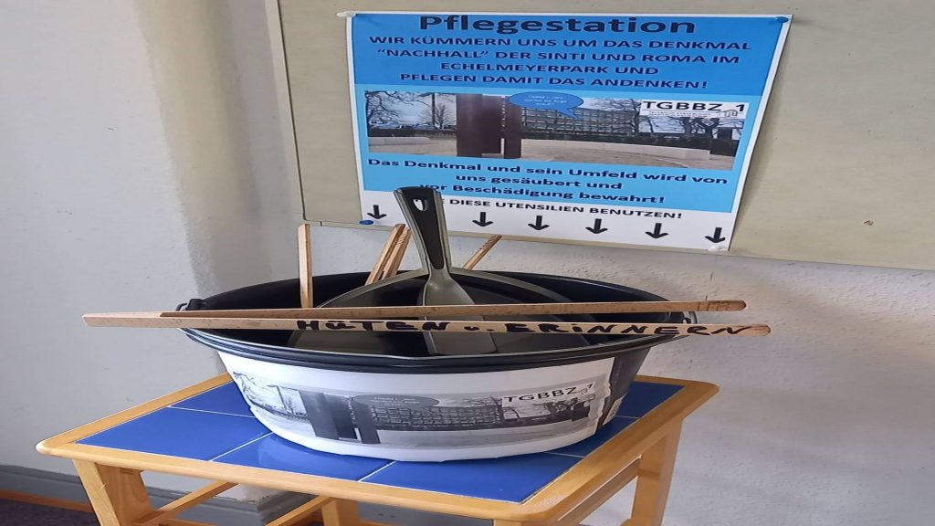 Aufgrund der wiederholten Schändung des Denkmals im Echelmeyer-Park starteten die Schülerinnen und Schüler des nahegelegenen TGBBZ eine Aktion zum Schutz des Denkmals für die ermordeten Sinti & Roma, welche in der Zeit des Nationalsozialismus ermordet wurden. Unter dem Motto „Hinschauen nicht Wegschauen“ kümmern sich die Schüler um den Gedenkort, melden verdächtiges Verhalten und reinigen bei Bedarf die Fläche. Der Landesverband Deutscher Sinti & Roma Saarland unterstützt und begrüßt diese wunderbare Tätigkeit und richtete als Dankeschön hierfür eine kleine Exkursion aus, welche in Kooperation mit der Stiftung EVZ, unter dem Projekt „Stärkung durch Kompetenz“, die Geschichte der Sinti & Roma im Saarland, den SChülerinnen und Schülern näherbringen sollte. (Bild Saarbrücker Zeitung)